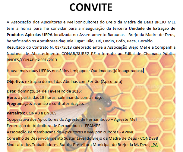 A APIME recebeu convite para participar da Inauguração da Unidade de Extração de Produtos Apícolas - UEPA no Assentamento Baraúnas - Brejo da Madre de Deus - PE.